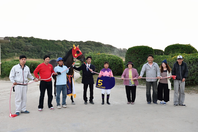 直線では、一旦はオスズが中を通って抜け出したが、その外からさらに3頭が伸びてきて、大外を進んだソウダイショウが最後にオスズを半馬身交わして優勝。東眞市厩舎の5連覇達成となった。