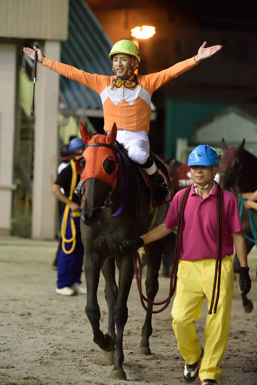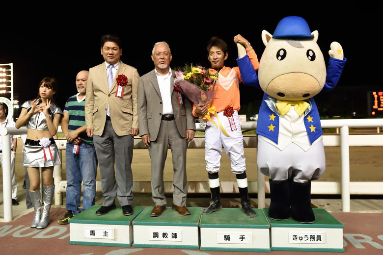 園田では前週の台風通過から、スーパージョッキーズトライアルが行われた前日まで水の浮く馬場状態。それゆえこの週の開催中も何度かコースに砂が補充されていた。しかし猛暑となったこの日は、発表こそ重だったが、馬場は急速に回復。そうした馬場状態の急速な変化を知っている地元の利も、エーシンサルサには味方したようだ。