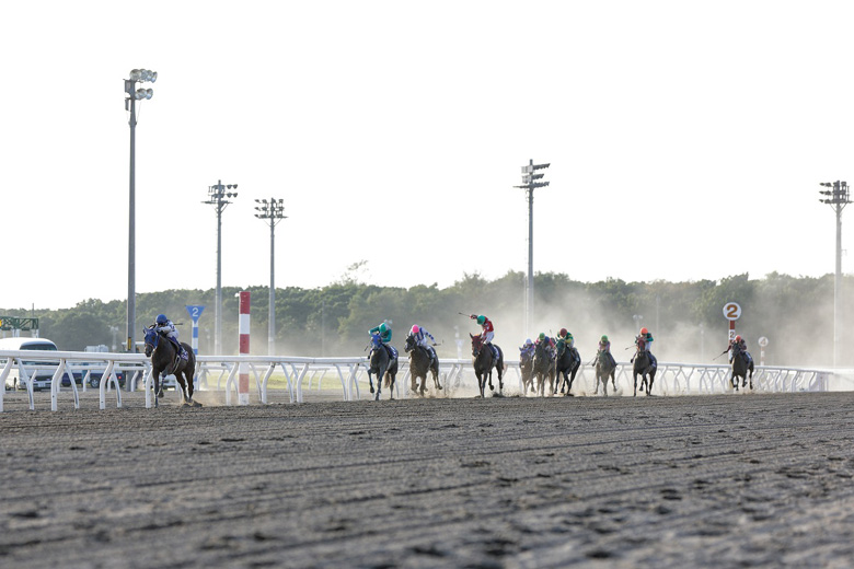 3コーナーの方向からゴール板に向けて夕陽が差し込む時間帯に組まれたメインレース。門別内回りマイルコースのスタート地点は、スタンド前の直線残り200mハロン棒付近にゲートが構えられる。背中から眩しい夕陽を受けた12頭が一斉にスタートを切り、1コーナーをめがけてまずはポジション争い。8枠スタートのリコールクレール(牝、北海道・川島洋人厩舎、父ケイムホーム)、ジャストゥラヴも好スタートから前を伺うが、最内から出たサムバディトゥラブがコーナリングで先手を奪い、ハナに立ってペースを握る展開になった。断然人気のタイニーダンサーは、前3頭を見るような位置で追走。そのまま向う正面のバックストレッチに入り、レースが動いたのは3コーナー。タイニーダンサーが押さえられない手応えで早くも先頭に立ち、持ったままで後続を引き離していく。4コーナーをまわって直線に入ると、あとはタイニーダンサーの独壇場。1頭だけ次元の違う脚で他11頭をどんどん突き離し、鞍上の桑村真明が手綱を動かすことなく余裕の優勝。そのあと2着サダムフジコがゴールしたのは、タイニーダンサーがゴール板を通過してから2.5秒もあとのことで、着差は「大差」と表示された。