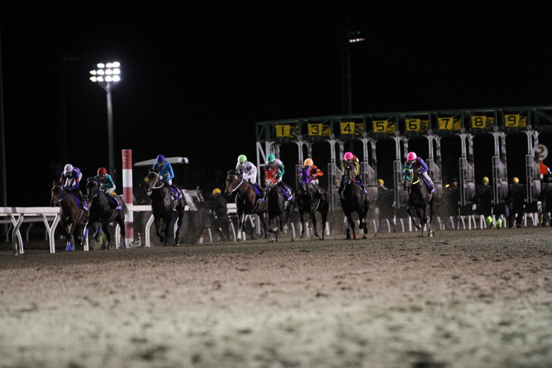 以上の4頭が単勝10倍を切るオッズで、モリデンルンバ(牡、北海道・柳澤好美厩舎、父マーベラスサンデー)以下4頭は単勝30倍を超すオッズ。雨こそ降っていないものの、前週からの不安定な天気の影響もあって稍重馬場発表の中でゲートイン。発走時刻の20時40分には、冬の足音がすぐそこまで来ているように感じるほど凛とした空気が競馬場を包み込んでいる。
