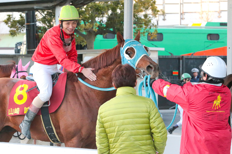 そうなると前に行った馬たちにとっては厳しくなったようで、レースを引っ張った3番手までの馬は最後に失速。その後ろの4番手からレースを進めた中野騎手が4コーナーで先頭に立って押し切りを図った。しかし最後の直線で伸び脚を発揮した山崎騎手のスーパーノヴァが差し切り勝ち。3着には、ここでもインコースを立ち回った繁田騎手が入った。