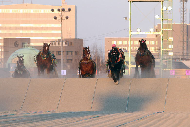 好天が続いてやや強い風も吹いていた帯広競馬場は、前々日から馬場水分量が1パーセントを切り、そしてばんえい記念当日の朝は0.8パーセント。レースが進むごとに馬場が乾いて砂埃が舞うようになり、本番直前には0.6パーセントにまで下がった。これは史上もっとも時計を要した2008年(勝ち馬トモエパワー)と同じ、もっとも乾いた馬場で迎えたばんえい記念となり、パワー勝負が予想された。当初、出走意思を表明していた馬は11頭いたが、2頭が回避となって出走は9頭。今シーズンここまで重賞3勝のオレノココロが単勝2.4倍で1番人気。ばんえい記念連覇のかかるフジダイビクトリーも同じく今シーズン重賞3勝を挙げており、単勝は3.1倍。連勝系のオッズを見ると、2頭が人気を分け合う形となっていた。
