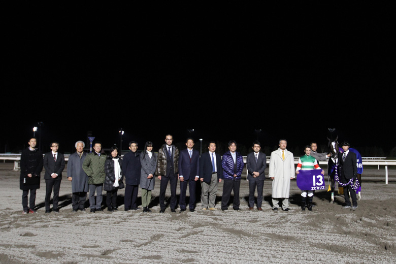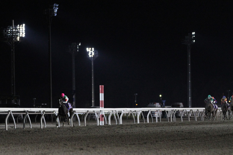 発走時刻、午後8時の気温は0.7度。寒空の下ファンファーレが鳴った。好スタートから抜け出したエピカリスがそのままハナに立ち、ゴーリキ、スーパーステションが続き、ひとかたまりでレースを進める。単勝2番人気のストーンリバーは中団。3コーナー過ぎからヒガシウィルウィンやビービーガウディ、リコーソッピースなどの後続が仕掛けはじめた。依然としてエピカリスは楽な手応えのまま、2番手以下の騎手たちが必死に馬を追う。