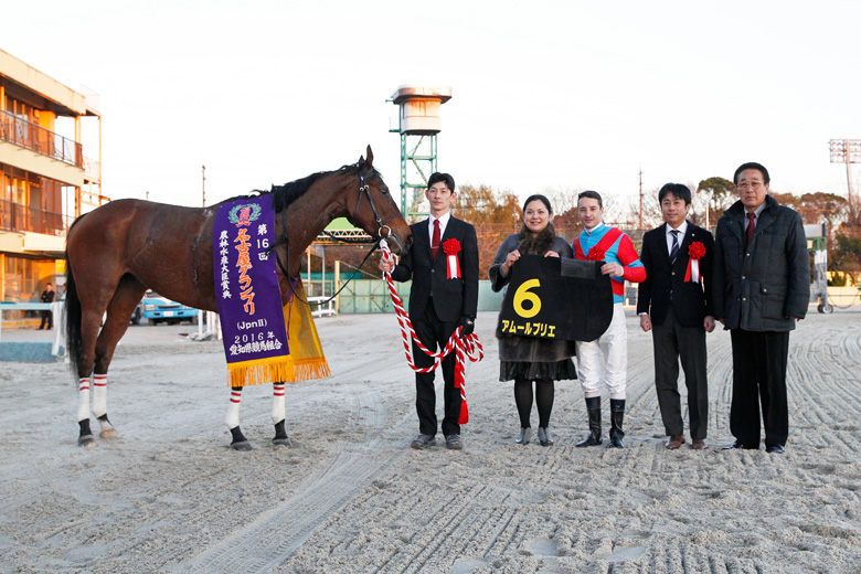 勝ったアムールブリエはこれで引退。来春はキズナを配合して、アメリカに渡る予定になっている。「今年はエンプレス杯を連覇、ブリーダーズゴールドカップを連覇、そして名古屋グランプリを連覇。偉い馬です」と、松永幹夫調教師。アウォーディー、ラニのきょうだいでもあるアムールブリエは、その繁栄の枝葉をさらに広げるべく、まずは北海道に旅立っていく。