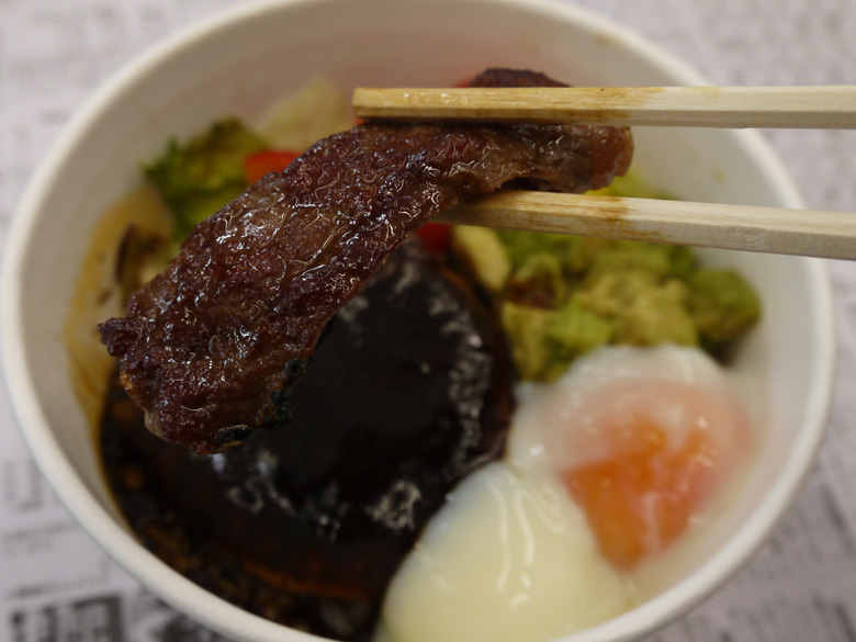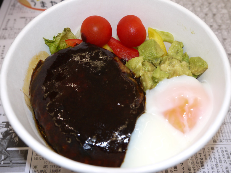 さっそく半熟たまごを少しずつ崩しながら賞味。ハンバーグには厚みがあって、フワフワ感を伴っているのがいい感じ。口休めにアボカドを食べると、オー!冷たい!そこは意外だったが、徐々にごはんの熱でいい感じに温まってきた。たしかにこれを加熱するのは変だものね。