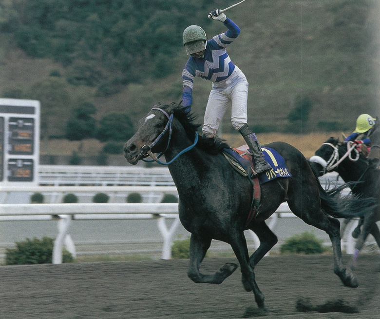 中央、地方交流の波は高知にも押し寄せる。高知競馬初のダートグレード競走、第1回黒船賞GⅢ。その名の通り黒船の如きJRA勢が4頭来襲。ストーンステッパーは根岸S、ガーネットS、そしてその年の5月には高崎競馬場の群馬記念を制したスピード馬。フジノマッケンオーは根岸S、さきたま杯だけでなく、芝のダービー卿チャレンジT、セントウルSにも勝っているオールマイティーで、鞍上は“天才”武豊騎手。ドージマムテキは3歳時皐月賞、日本ダービー出走の王道を歩み、短距離路線に的を絞ってからは京王杯オータムハンデ勝ち。活路を求めて今回2度目のダート挑戦。さらに、勝ち星からは遠ざかっていたものの、ガーネットS、平安Sに勝っている12歳の古豪ミスタートウジンが出走してきた。