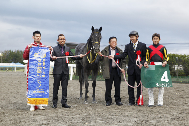 ヴィーナスアローは、金沢リーディングを独走する金田一昌厩舎の管理馬。昨年は5頭出しで臨み、今年はほかにエングレイグとバーバリアンという計3頭を送り込んだ。しかしそのエングレイグは先手を取れず、バーバリアンは出遅れ。アガタピアスが先頭に立ち、2番手にワンダフルキングスで、人気薄2頭が先行する展開は、やや速めの流れに映った。
