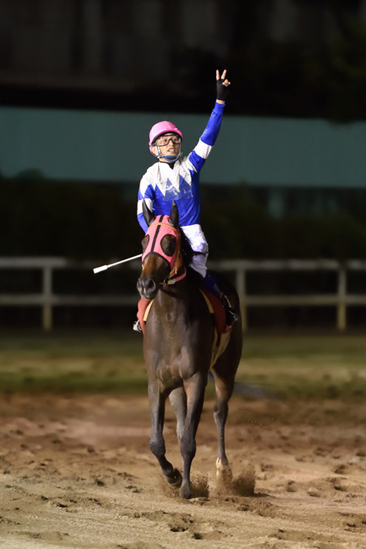 4コーナーあたりでもぜんぜん勝てる感じはなかったです。最後は人間のほうがバラバラになって、ゴールしても勝ったのかどうかわからなくて、馬が勝手に動いてくれた感じでした。すごい馬ですね。名古屋の2戦目(東海クイーンカップ)の負けから変わってきて、のじぎく賞からさらに強くなりました。