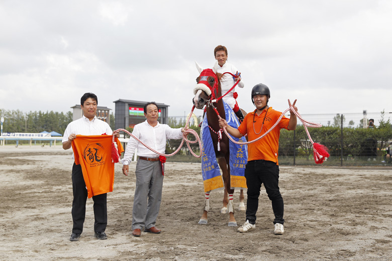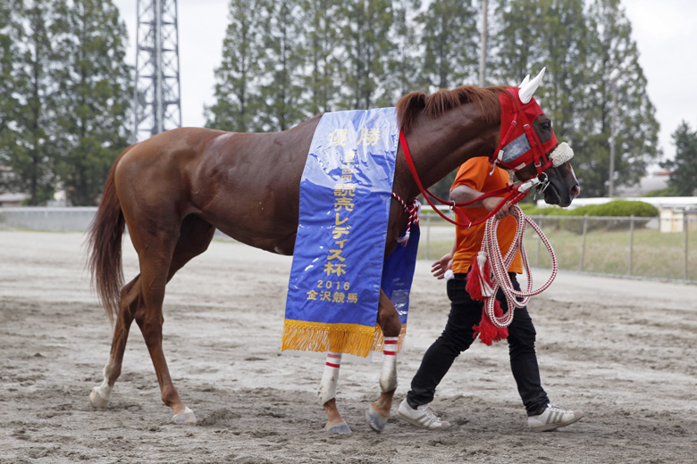 前走から間隔がなかったですが、むしろそれがよかったみたいです。馬体重はマイナス9キロでしたが、それがいつもの体重ですから。園田は勝っても負けても金沢へ行こうと決めていました。地元だと馬場入りでものすごくうるさいんですが、遠征のほうが落ち着いてまじめに走るので、いいみたいです。