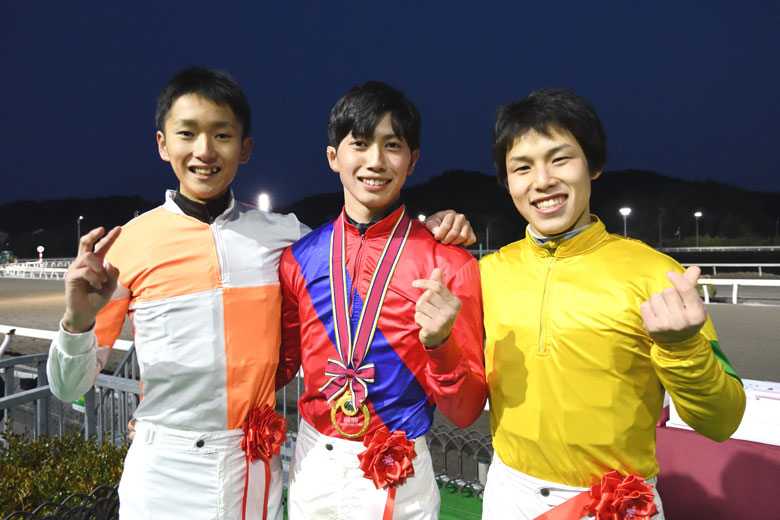 向正面から馬群の外を通って進出を始め、早め先頭から押し切ったのは加藤騎手。その3/4馬身後ろの争いは4頭が横に広がり、2コーナーでは7番手あたりにいた木幡巧也騎手(JRA)がインコースから2着に入った。3着に食い込んだのは、スタート直後から最後方を進んでいた保園翔也騎手(浦和)。「行き脚がつかなくて、それでも前は止まると思って乗っていたら、本当に止まりましたね。ただ、ゴール地点では2着かなと思ったんですが……」と、勝利を喜ぶ同期の加藤騎手を横目に見ながら話していた。僅差の4着に入った塚本騎手は、検量エリアに戻ってくるなり「2位に入れたでしょうか」と報道陣に質問。その結果はほどなく発表され、優勝が5着、1着の加藤騎手。続いて2着、4着の塚本騎手と1着、7着の坂井騎手が同点で並び、第2戦の着順が上だった塚本騎手が第2位になった。