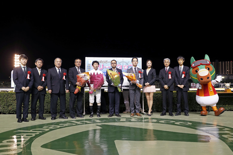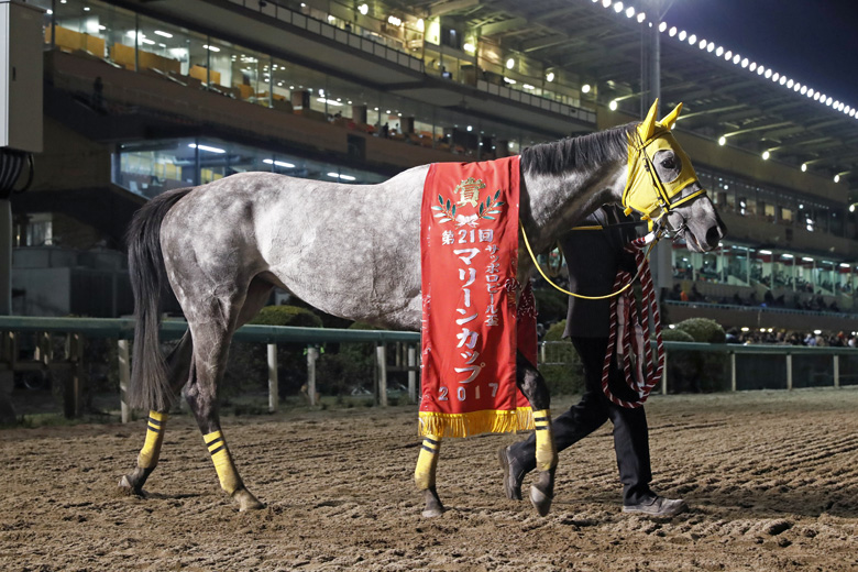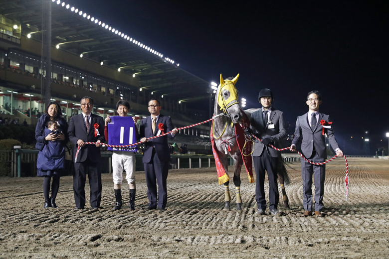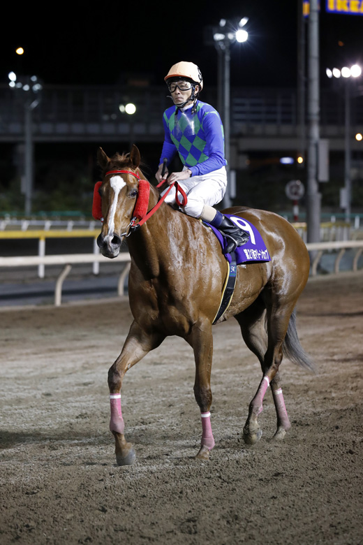 母のマリーンウィナーは、亡き川島正行厩舎所属として船橋競馬場を中心に走った馬。そんな母の思い出の詰まった場所で初めて肩掛け姿を披露。通算6つ目の重賞勝ちとなった。