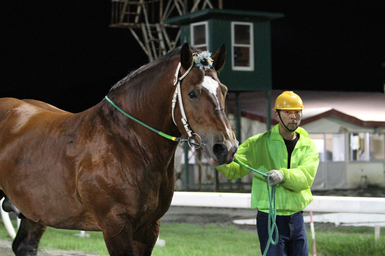 ファン投票によって出走馬を決める、ばんえい競馬の真夏の大一番、第29回ばんえいグランプリ。お盆休みと、道内でも最大級の規模を誇る勝毎花火大会の日程が重なって帯広近郊は大混雑。ナイターレースのためスタンドからも花火を観られるとあって、帯広競馬場には7,812人が訪れた。1カ月前には37.1度まで気温が上がって日本一の暑さを記録した帯広だが、この日のレース時は16度と肌寒い。パドックで見る馬たちも涼しい気候のおかげか調子が良さそうだ。朝まで小雨が降り続き、馬場水分は1.8%の軽馬場となった。1番人気は通算4000勝まであと4勝となった藤本匠騎手のコウシュハウンカイだった。