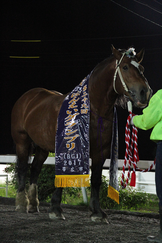 2頭の競り合いはゴールまで続き、ニュータカラコマが約半馬身の差を縮めさせないまま押し切り、ばんえいグランプリ初制覇を果たした。惜しくも2着のコウシュハウンカイ・藤本騎手は「いい位置で降りているのに歩かなかった」と悔しそうな表情。ファン投票1位のオレノココロは3着だった。