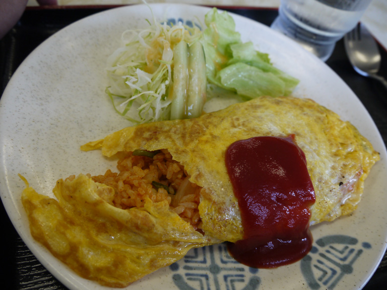 卵焼きを崩してみると、中身もきちんとケチャップで炒められている色合い。昼下がりのひとときをこういうランチとともに過ごせるなんてゼイタクですなあ。客層を考えてなのか、味付けがちょっとソフトな感じがしたので塩を振ってみたら、個人的な好みにピッタリくる味になりました。