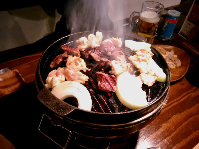 冬の帯広地方は氷点下が当たり前。気温が低いと体温をキープするためにカロリーがどんどん消費されていくようで、最終レースの時間になるとかなり腹ペコ。すると地元在住の友人から「ジンギスカンに行きましょう」とのお誘いが。場所は競馬場の入場門のところにある『とかちむら』とのこと。ならばすぐに入れるじゃないの!ということでさっそく行ってみると、テーブルの上にはアツアツな色をした炭が入った七輪がドン。私を誘ってくれた人はすでに常連状態になっているらしく、注文しなくてもお肉が勝手に出てきました。