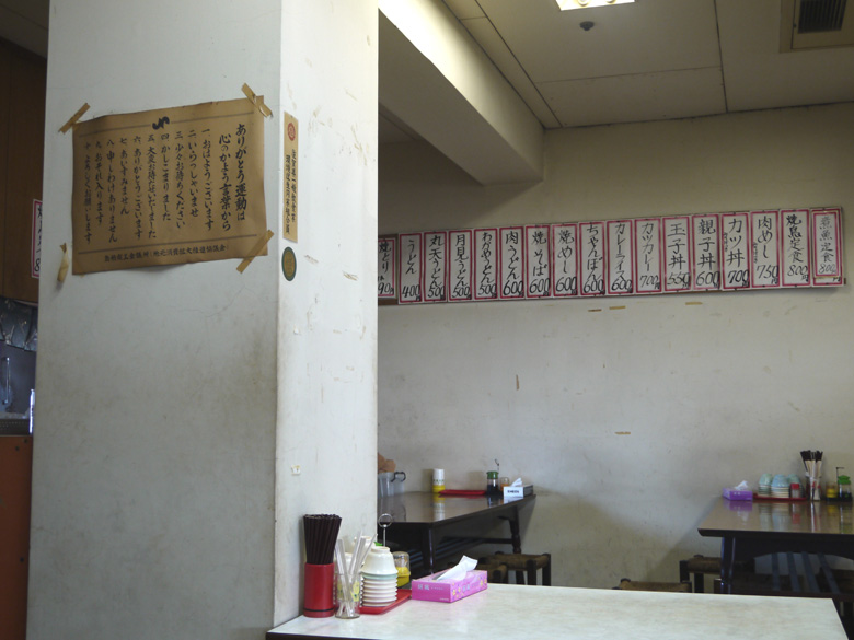 3階には食堂が3つあって、4コーナー寄りに2つでゴール寄りに1つ。しかし私が目指すゴール寄りの「朝日屋」さんは、2回見て2回とも店内に人の気配がなかったのです。店先には看板がないし、これはいわゆる「一見さんお断り」だったりして……