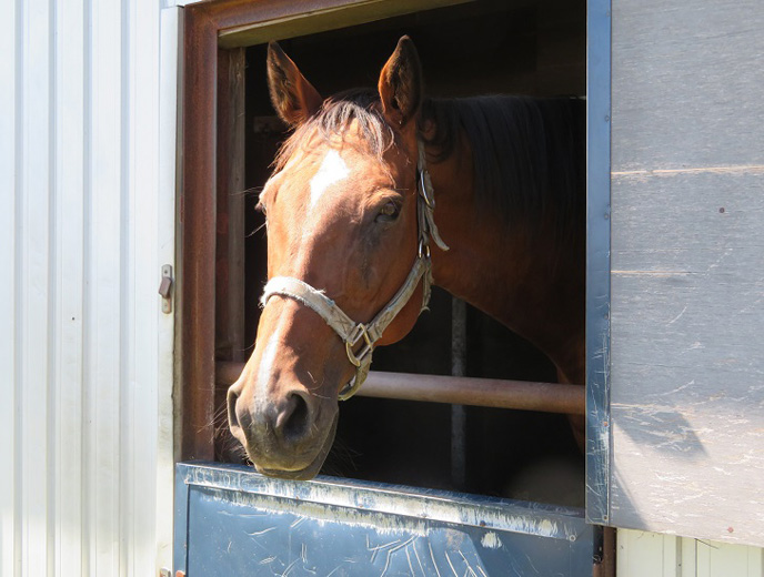 私がおじゃました時、イケノエメラルドはちょうど放牧を終えて馬房でのんびり過ごしていました。その後にカイバを食べていたのですが、お尻を向けると、迫力たっぷりの体には圧倒されてしまいました。21歳のおばあちゃんですが、毛づややハリは抜群で、健康体なんだろうなと。長生きして欲しいですね。