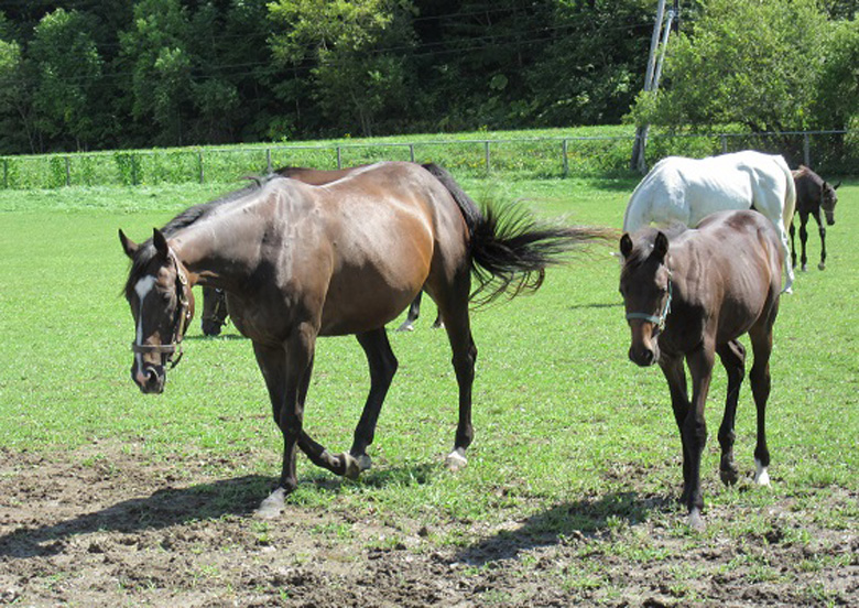 現在は1歳牝馬(父 トゥザワールド)がスクスクと成長しているそうで、お腹にはトゥザグローリーの仔を宿しているとのこと(3月20日頃出産予定)。