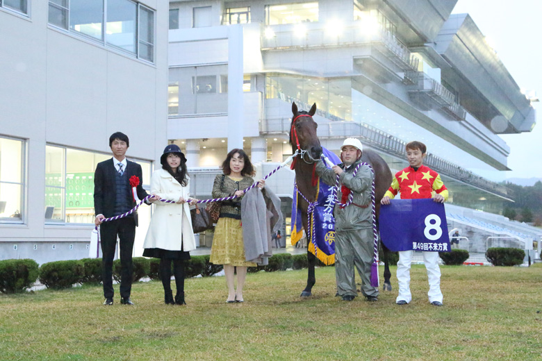 やまびこ賞からの4連勝はいずれも僅差。今回の0秒3差でさえ、この中では最も大きな着差となった。レースタイムは当初より速い時計になることが予想されたが、ここ2年2分10秒台だった数字を5秒以上上回って2分4秒6。1996年OROパーク開設以降の不来方賞(うち2回水沢開催)での最速タイムを記録した。
