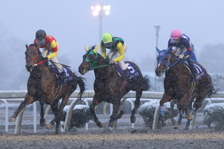 今年新たに始まった『3歳秋のチャンピオンシップ』のファイナル、ダービーグランプリ。ボーナス獲得の可能性があるのは、地元岩手のキングジャガー(不来方賞)と、高知のフリビオン(西日本ダービー)。そのほかにも、岩手所属ながら北海道の二冠を制したベンテンコゾウをはじめ、そのベンテンコゾウの北海道三冠制覇を王冠賞で阻止したスーパーステション、MRO金賞を制した金沢のムーンファースト、盛岡の芝重賞を勝っているブラックロードにソーディスイズラヴなど、全国から充実のメンバーが揃った。岩手競馬は盛岡開催が終了すると一気に冬到来となるが、この日の水沢競馬場は朝から雪。昼頃に青空が広がる時間帯もあったが、その後も断続的な雪で、ダービーグランプリは雪景色でのスタートとなった。