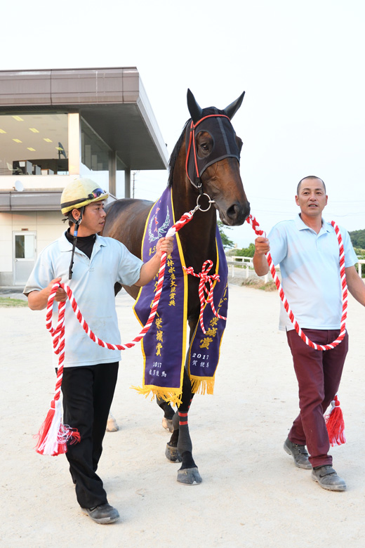 鞍上の鮫島克也騎手は「デビュー前の発走検査で跨ったたときに、あ、ダービー勝つのはこの馬だなと思った。栄城賞の時点ということなら(自身が騎乗して栄城賞を勝った)キングプライドやエスワンプリンスよりも強いと思っていたのに、今日は厳しいレースになってしまいました。南関東から戻ってきて、筋肉が落ちてしまっていたので、これからもっと良くなると思いますよ」と、期待どおりにまずは栄城賞を勝利。今後は佐賀を代表する名馬へと飛躍していきそうだ。