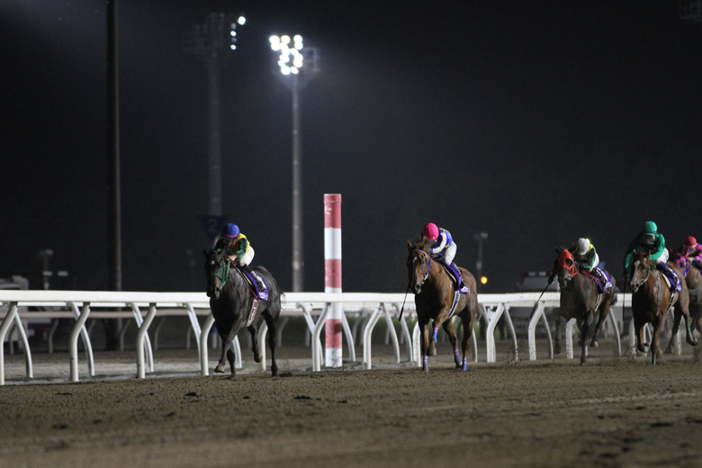 メインの夜8時台になると半袖では寒い門別競馬場。レースはそろったスタートから、大外バラブシュカが積極的に先頭を奪う。団子状態で、ジュエルクイーンは包まれる格好になり4番手。2番人気のビービーバーレルは、前走でジュエルクイーンにマークされ厳しい展開になったのとは逆に、ジュエルクイーンを前に見ながらレースを進めた。