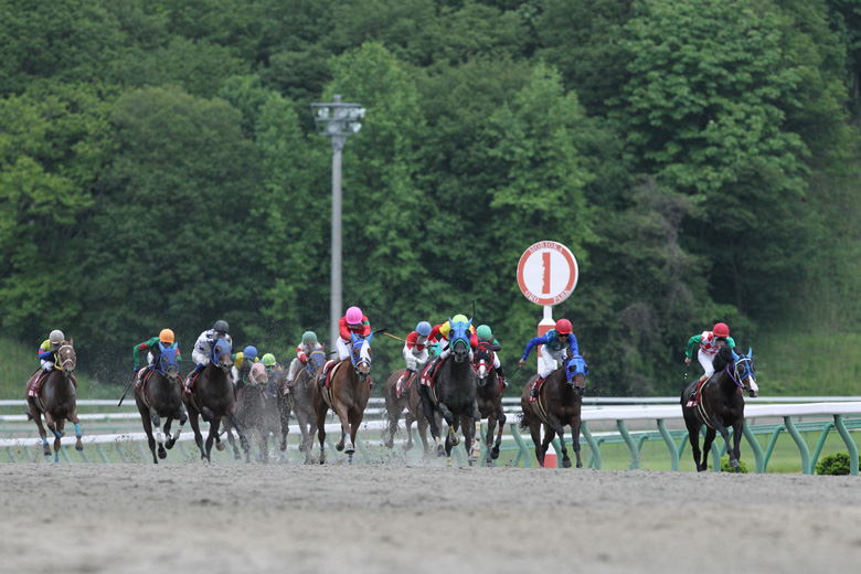 第2戦は、盛岡競馬ならではの芝1700メートル戦だ。芝コースが初めてという馬や、前走で芝1000メートル戦に出走している馬も何頭かいて、展開予想も難しい一戦。逃げたのは1番枠の藤田弘治騎手(金沢)で、2番手に永森騎手、3番手の内に中野騎手が続き、好位の外を真島大輔騎手(大井)が追走していた。道中で動きはあまりなく、4コーナーをまわるとジョッキー達の腕が一気に動き始めた。横並びの中から抜け出したのは真島騎手だった。最後は中野騎手も内から迫ったが、3/4馬身差及ばず。3着争いは大混戦となったが、13番人気の佐藤騎手が入った。