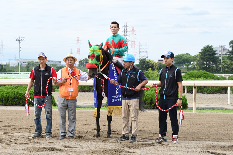 しかし最後の100メートル、いや50メートルくらいだろうか。マルトクスパートが猛然と追い込んでカッサイに並びかけたところがゴール。見た目にはかなり微妙だったが、鞍上の田中学騎手は勝利を確信。ゴールを過ぎて左手で小さくガッツポーズを見せた。
