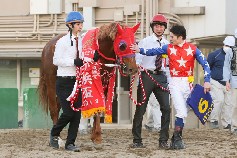 優勝したステッペンウルフは昨年、北海道から船橋に移籍し3、2、1、1着という勢いのまま今回重賞初制覇を飾った。佐藤賢二調教師は「中間も思った通りに調教ができて内心は勝ち負けになるんじゃないかと思っていました」と満面の笑顔。NARグランプリ年度代表馬を2年連続で送りだしたこの厩舎の実力を改めて実感させられる。