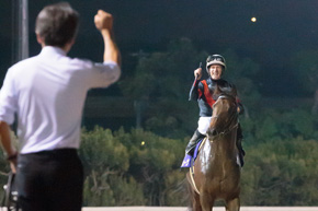 今日は人気に推されていましたし勝ててほっとしています。いいパフォーマンスを見せてくれました。今日はそんなに危うさを感じないレースでしたね。最後の200メートルくらいからは力が入り、抜けてほしいという思いでした。今日は落ち着きもあって動きも良かったと思います。もっと成長できる馬です。