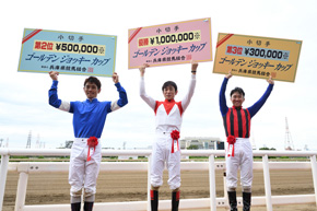 熾烈だったのは総合3位争い。わずか1ポイント差の間に3名の騎手がひしめく中、表彰台に立ったのは吉原騎手だった。「よしっ!よしっ!」と笑顔炸裂で、横にいた赤岡修次騎手(高知)からは「やっぱりねぇ、この人、上手やから」と茶々を入れられていた。勝利こそなかったものの、第3戦で10番人気ながらアタマ差3着に入ったことが表彰台を引き寄せたのだった。