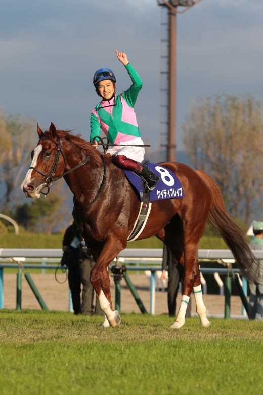 昨年3月から、13戦続けて騎乗している福永祐一騎手は脚質転換の成功を勝因にあげた。昨年の平安ステークスGⅢまでは逃げか先行して2番手からでないと結果が出なかったケイティブレイブだったが、続く帝王賞JpnⅠでは出遅れて後方追走から直線一気の末脚で差し切って、周囲を驚かせた。それ以降は、福永騎手がどんな展開になっても、対応できる競馬を教えた。距離不足で11着に敗れたフェブラリーステークスGⅠを別とすれば、9戦4勝、2着、3着が各2回、4着1回とすっかり安定した。「今日もポジションは決めずに、流れに任せて無理せず、リズムが守れる外めにつけました。今では何でもできる馬になりました」と胸を張った。