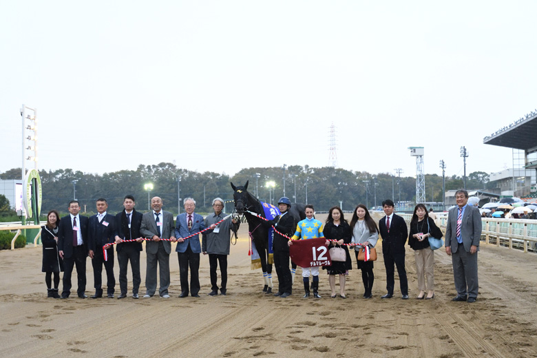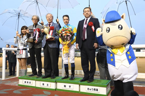 この秋、中央のGⅠ/JpnⅠレースで4週連続勝利を含め5勝のルメール騎手は、その勢いをそのまま園田に持ち込んだ。「鞭を使わなくても伸びたし、楽勝でした。自信を持って乗ってました」と傘の花が咲くウイナーズサークルの中心で満面に笑みを浮かべた。