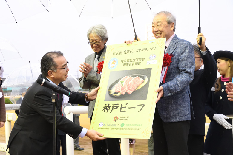 地方競馬全国協会理事長賞の副賞として畜産品が贈呈された