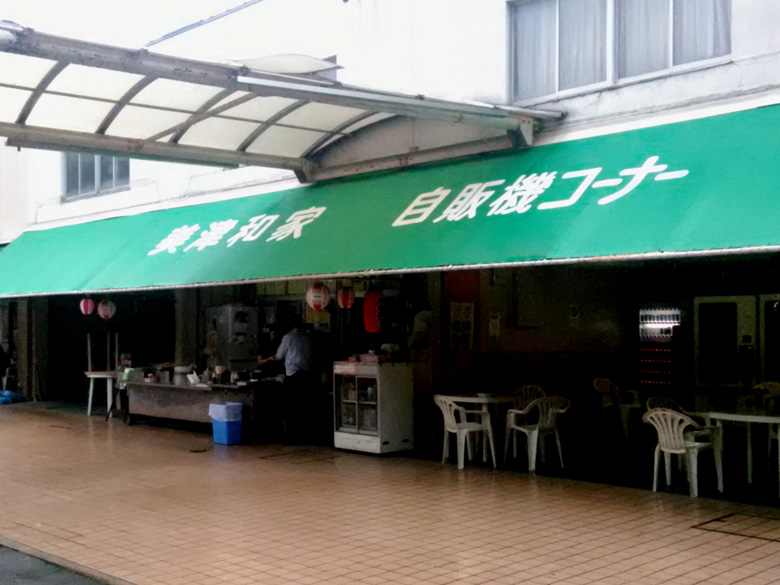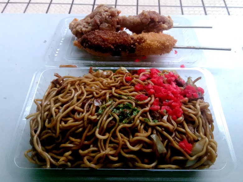 と思ったので、焼きそばとから揚げ串にも出演していただくことにしました。店頭で焼きそばが調理されているのは「美津和家」さんだけなのでそこで買い、続いて「寿屋」さんに移動して、ウインナー串とから揚げ串を購入。それを2つの店の間にある休憩コーナーに持って行って写真を撮りましょう。