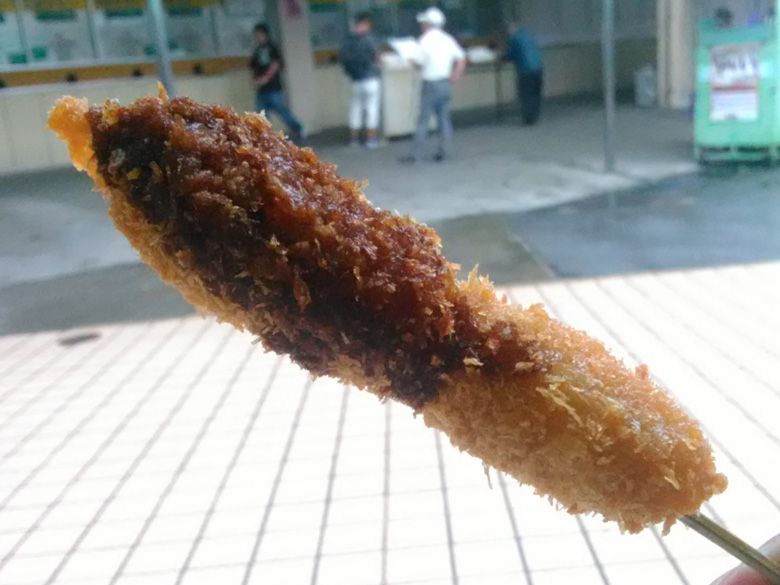 さあ、ではさっそくウインナー串からいただきましょう。お弁当に入っているのをよく見かける赤ウインナー2つを縦に串刺しにして衣をつけて揚げたものですが、そもそもウインナーを揚げることが関東人の私には斬新。ウインナーって焼くか茹でるかですよね?
