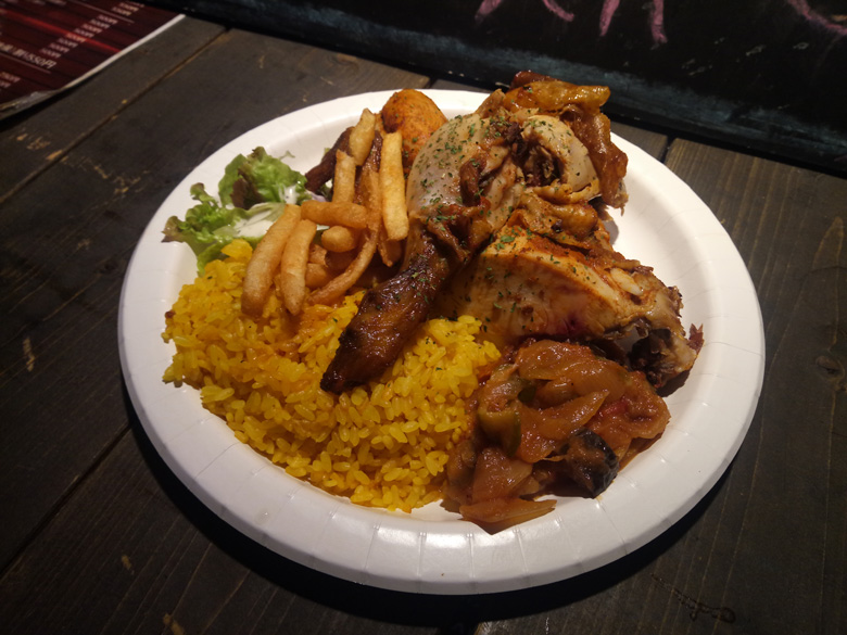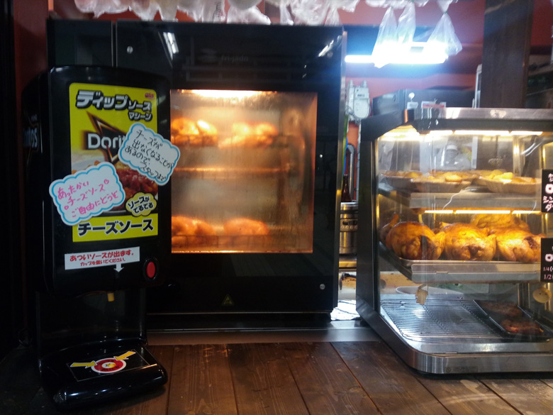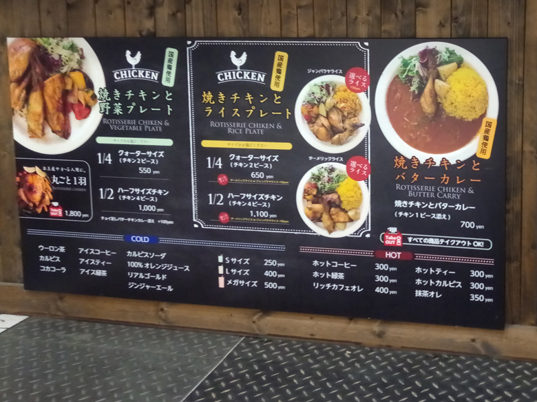 ちなみにロティサリーとは“鶏をまるごと串に刺して、回転させながらあぶり焼きにした料理”なのだそうで、店頭のオーブンでは鶏が脂をしたたらせながら縦に回転中。さてさて、どれを注文するかと迷った結果、「大きいことはいいことだ」ということでハーフサイズチキンのライスプレートにしてみました。