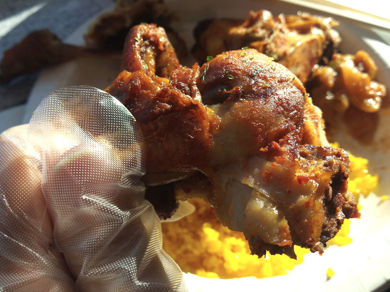 まずはターメリックライスを少しずついただきながら、大きめの鶏肉からスタート。おお、ほどよくスパイシーで、鶏の肉汁も残っていてチョーウマい!