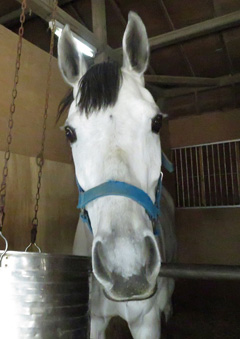 メイプルキュートは芦毛なので、デビューした頃の写真を見ると毛色は淡いグレーでしたが、今ではすっかり白くなりました。瞳はビー玉のように黒々としていて、見つめていると吸い込まれそう。ルックス的にもとても愛らしく、『キュート』という名前がピッタリです。