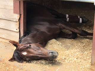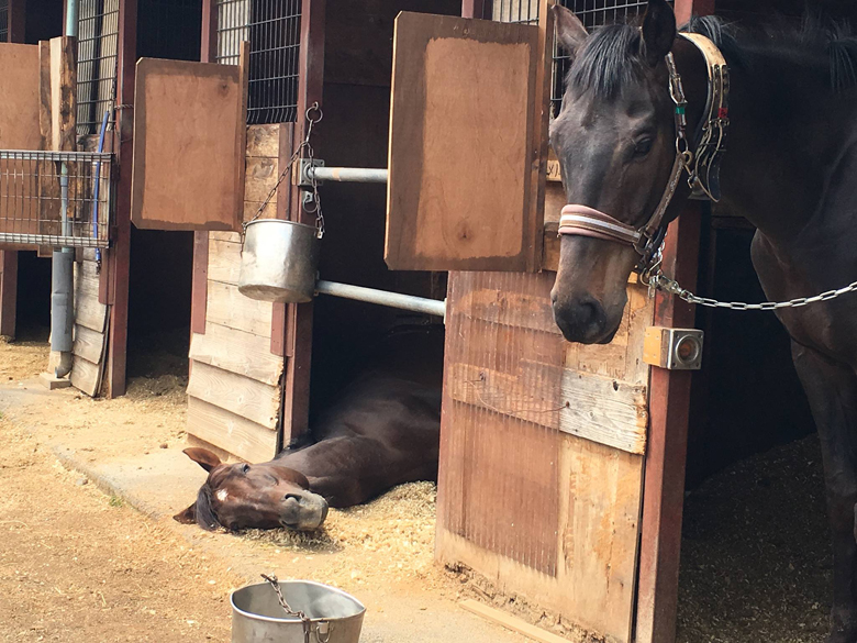 乗馬クラブスリーフィールドの久米知子代表のお話しでは、入厩した頃からとても大人しい馬で、去勢はしていないそうですが牝馬に反応することもないそうです。現役時代と変わらずに、真面目で一生懸命な性格だそう。14歳になりましたが、病気もしたことがない健康体とのこと。この写真を見ても、のんびりまったりくつろいでいて、幸せムードが漂っています。
