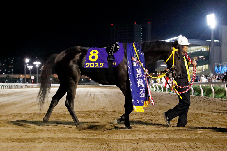 そして馬群から抜け出して追ってくる馬が1頭。クロスケが、残り200メートルあたりからじわじわと差を詰めてきた。3番手以下は大きく離れ、粘り込みを図るクリスタルシルバーに、外からクロスケが並びかけたところがゴール。いずれが勝っても初タイトルとなるところ、クロスケがアタマ差とらえていた。