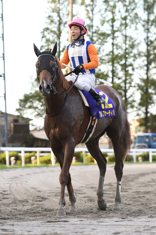 そして最後の直線、アルファーティハはラチ沿いで懸命に粘り込みを図った。前が速くなることを見越して後方待機から直線勝負に賭けた吉原騎手のエムザックヒーローが迫り、さらに中団追走から大外に持ち出したハーキマーダイヤが追い込み、ゴール前は3頭が馬場一杯に広がっての接戦。アルファーティハがハーキマーダイヤをハナ差でしりぞけ、3頭出しだった金田厩舎のワンツー。エムザックヒーローは1馬身差で3着だった。