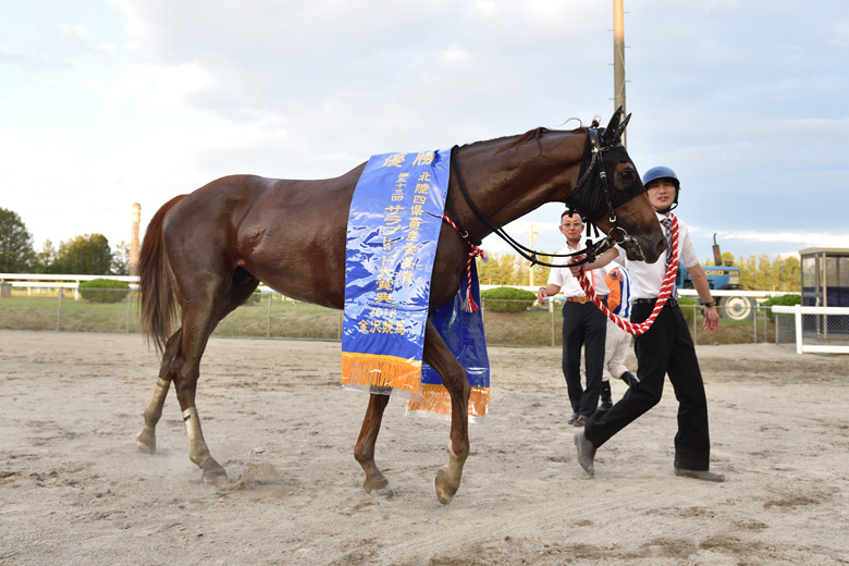 前走(MRO金賞)は抑えて馬の力が出せませんでした。太目もあったので、今回は絞って(マイナス13キロ)完璧でした。オーナーが秋田の方なので、水沢のダービーグランプリを目指したいと思います。2着のハーキマーダイヤは米倉騎手に絶対の信頼があったので、正直なところ同着で、と思いました。