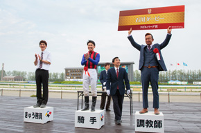 結果としては3番人気馬までが上位を独占。その3頭には及ばなかったが、8番人気ながら果敢に先行したジュウワンローズが4着に入った。「本当は岡部さんの内に入りたかったんですが、大外枠でしたから。でも成長していると感じます。秋は西日本ダービーを目指したいですね」と、青柳正義騎手は手応えを感じた様子。6着のエムザックヒーローも「ゲートのなかで力んでいて出遅れました。でも実力はありますから、夏を越して精神面が成長すれば」と、中島龍也騎手もまた、10月23日に金沢競馬場で行われるもうひとつのダービーに期待を寄せていた。