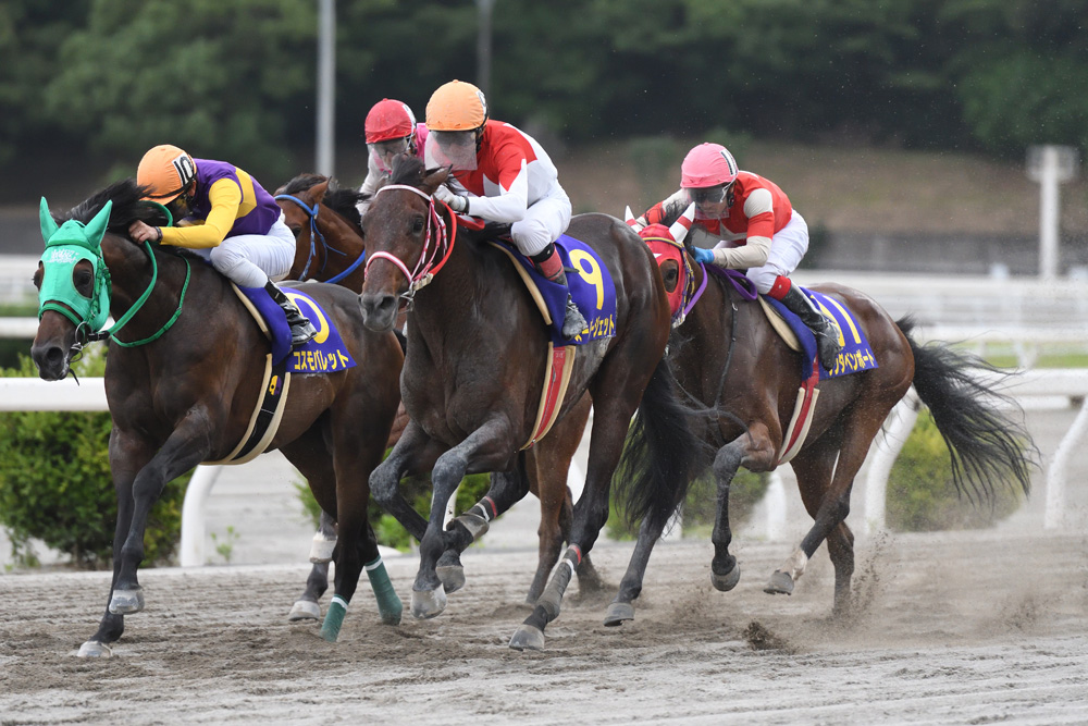 この日の昼の気温は27度ほど。馬場状態の発表は重でも、表面の砂は白く乾いて、馬群が通り過ぎると砂煙が高く舞い上がっていた。そのなかで先手を取ったのは、逃げ先行で結果を残していた地元のスターアイリス。2番手グループはコスモバレット、ヴァリヤンツリなどの4頭がほとんど一団で、ノブイチ、スーパージェットは先行集団の直後を追走していった。