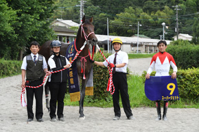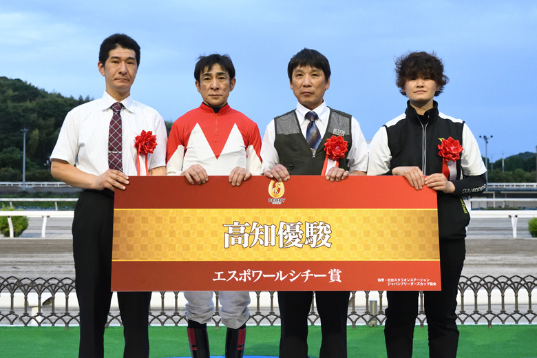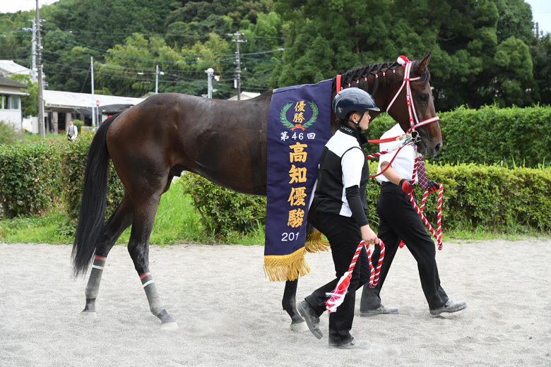 九日俊光調教師は昨年も九州ダービー馬のスーパーマックスを出走させたが、他馬の落馬に巻き込まれて競走中止に終わっていた。「でも、このレースに対して悪い印象は持っていなかったですよ」と話したが、レースからしばらくたっても“信じられない”という表情をしていた。しかし表彰式で「佐賀所属馬が高知で重賞を制したのは初めて」と聞かされると、うれしさがあふれる顔に変わった。