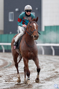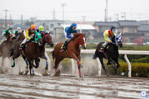 春分の日とは言え、冷たい雨が降り続き、時おり雪が舞うような悪条件。馬場は水が浮くほどの不良馬場となった。