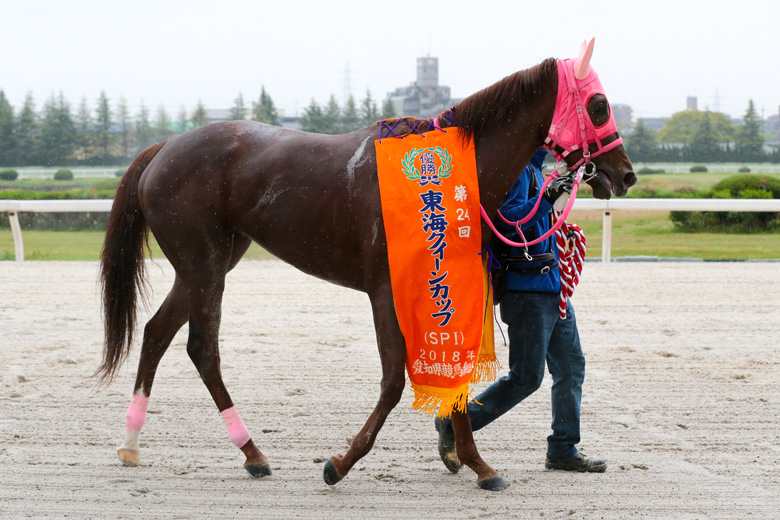 グランダム・ジャパン3歳シーズン折り返しとなる第4戦・東海クイーンカップ。お昼前後から雨がパラつき始めた名古屋競馬場は、7、8、10レースで前が止まらない逃げ馬天国だった。そんな中、単勝1.9倍の1番人気に推されたのは末脚が武器のレコパンハロウィー。出走馬中唯一の重賞勝ち馬で、グランダム・ジャパン初戦の若草賞は後方からの差し切り勝ちなだけに、騎乗する大山真吾騎手も「今日は前残りですね」と馬場状態を気にしているようだった。2番人気は南関東から参戦のノートゥルレーヴで3.4倍、3番人気に地元ウォーターループが7.1倍、4番人気リボース9.4倍と4頭が単勝オッズ一桁台となった。
