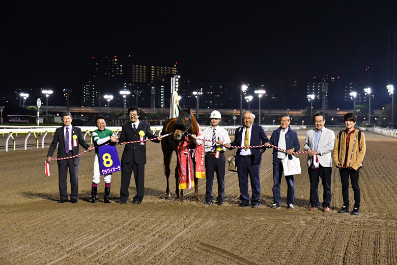 そのままの態勢で直線を向いたが、内のストロングハートがまず脱落。やがて鞍上の手が激しく動き出したのはプロミストリープで、それを冷静に見ていたのはグラヴィオーラの今野忠成騎手。タイミングを見計らって追い出され、残り200メートル手前で前に出ると、その差はみるみる広がった。ゴールでは7馬身差をつける圧勝。3着にはさらに7馬身差がついて、道中は中団を追走していたゴールドパテックが入った。