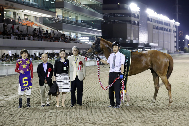 勝負どころの3コーナーを迎え、手応えよく2番手に上がるゴールドパテックと山崎誠士騎手の姿がビジョンに映し出されると、スタンドからは「おお!」というどよめきが。その後ろではハービンマオが人気馬たちを交わし3番手まで迫っていた。直線に入ると、ゴールドパテックが先頭に立って押し切ろうとするところに、ハービンマオが外から差を詰める。ゴール前ではハービンマオの勢いが勝り3/4馬身差で1着を勝ち取った。2着から4馬身の3着には逃げたクレイジーアクセル、4着にミスマンマミーアが入り、地方馬の健闘が目立った。1番人気のララプリムヴェールは6着に敗れた。